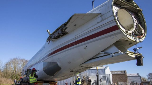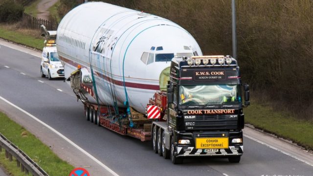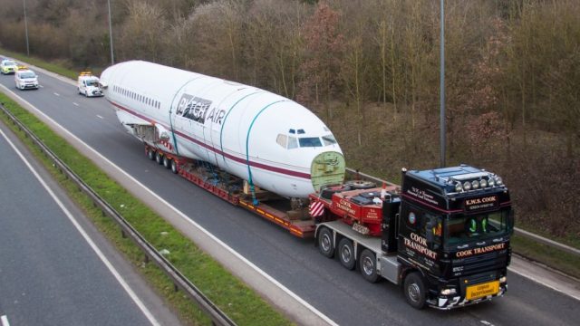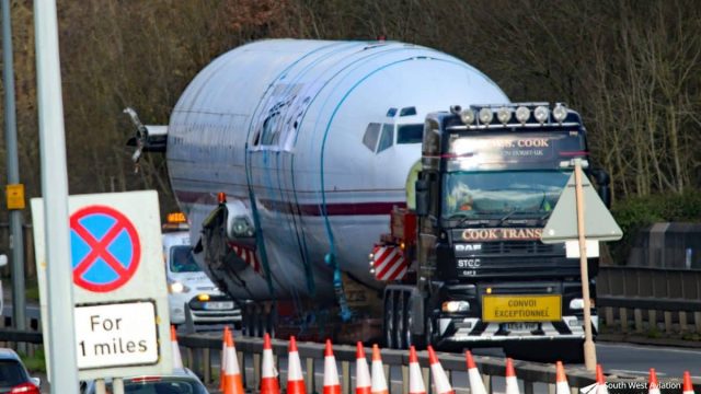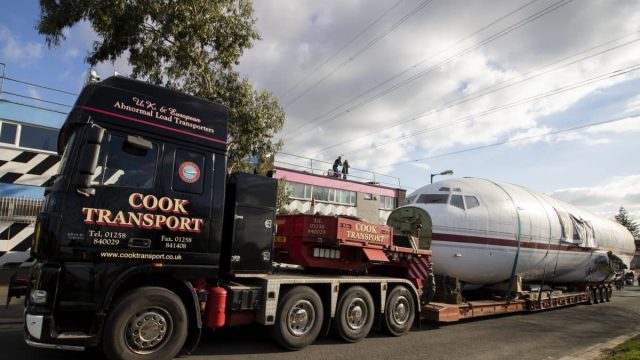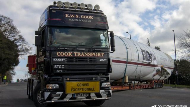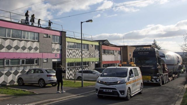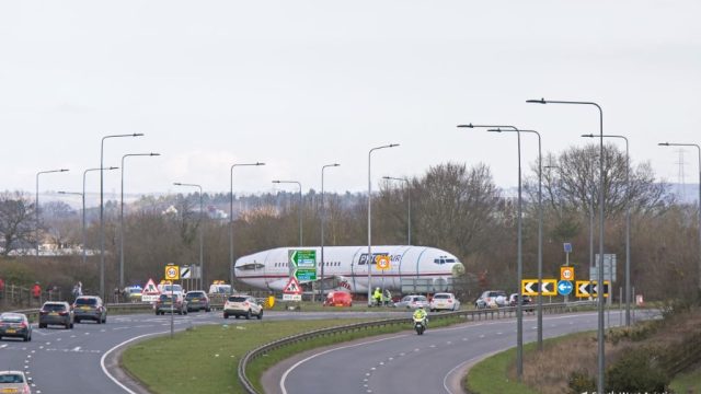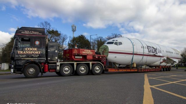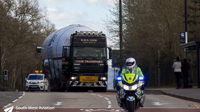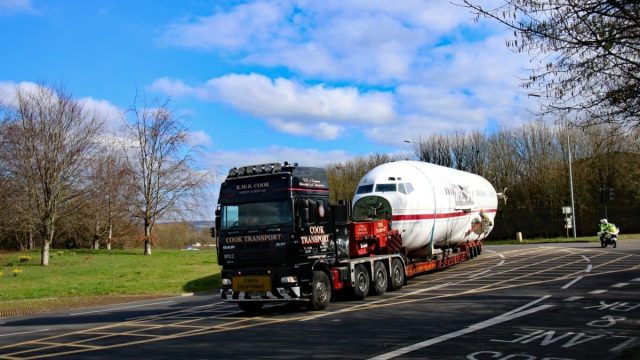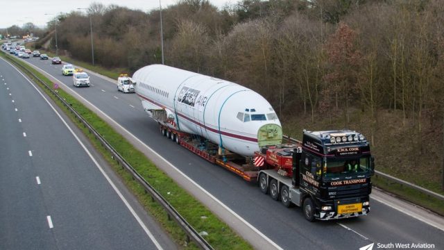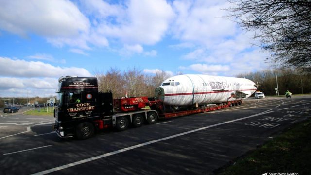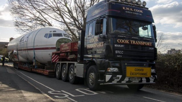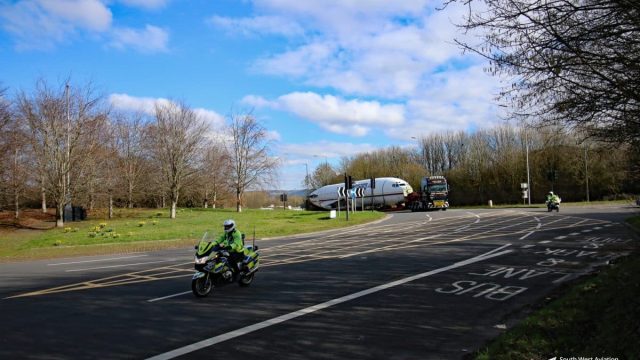 Leaving Cotswold Airport dead on 0830hrs on Saturday 27th February the 40 metre load was in the hands of aviation haulage experts Cook Transport, with an escort being provided by the Roads Policing unit of Gloucestershire Constabulary, the convoy headed north through Cirencester, and onto the A417 and soon faced the first challenge of the journey, the Air Balloon Roundabout which required the lorry and the specialised rear wheel steering trailer to fully circumnavigate the roundabout, allowing the abnormal load to exit the roundabout on a much less tight angle. Reaching the M5 just before 1030hrs the convoy had a trouble free passage heading southbound down to Michael Wood Service Station where Gloucestershire Constabulary handed over to their counterparts in Avon and Somerset to escort the 1960’s airliner on down the M5 to the Almondsbury interchange, along the M4 to Junction 19, then the very short section of the M32 before following the A4174 all the way around to the Hicks Gate roundabout where it then travelled up the A4 Bath Road to the junction with Emery Road. It was here that what has been said to have been the most challenging section of the journey came when Steve, the now legendary lorry driver, had to adjust the suspension of the trailer unit to stop it grounding out on the camber of the road, before completing a three point turn on the busiest A road in Bristol. Of course no logistical task of this scale could go without a hiccup as just metres away from PytchAir’s final resting place at the junction of Emery Road and Bonville Road sat a lonely people carrier which proved to be right in the way of the convoy’s path which meant that everything stopped until the vehicle could be removed. Johnny expected challenges in this final stage of the journey and commented in one vlog “we don’t really know if this is going to work as no one’s ever brought a 727 up Bonville Road before“. Thankfully that was the last issue and eventually PytchAir cruised up Bonville Road, arriving at its final destination just before 1600hrs.