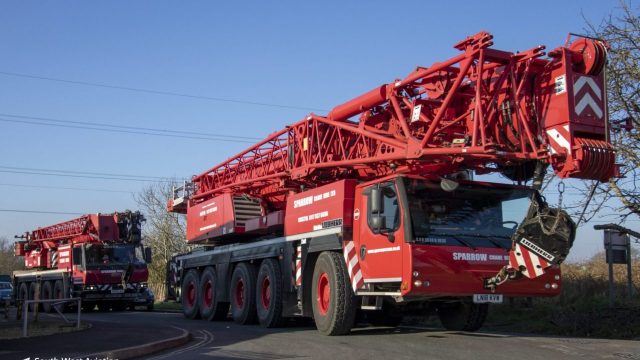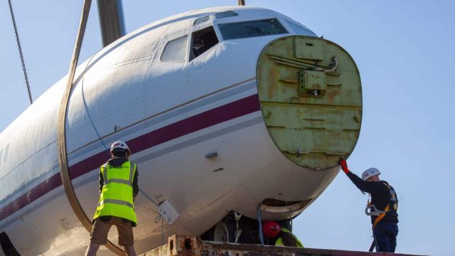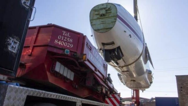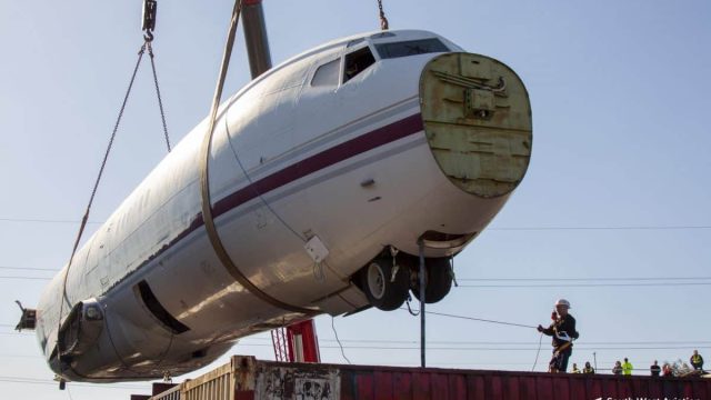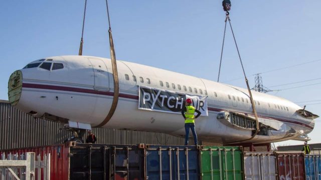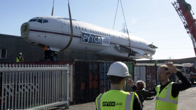 The hard work didn’t stop on Saturday though. On Sunday exactly one year to the day since Pytch provided event support to Greta Thunberg’s youth climate change protest, the team completed the ultimate in upcycling. Just after 0930hrs two huge mobile cranes from Sparrow Crane Hire arrived on Bonville Road. With the weight of the airframe needing to be distributed evenly between the front and main landing gear areas on the fuselage a game of Tetris had to be played. First PytchAir had to be driven out of the yard in order to get the 200-ton crane into position followed by the supporting articulated lorry carrying the ballast for the larger crane. An 80-ton crane was set up at the front of the yard and this slightly smaller crane would be lifting the front end of the airframe into place. Once this crane had been set up Steve the driver was able to reverse the 727 back into the yard, and the task of positioning PytchAir onto its new home, a bed of ISO shipping containers, was completed. After a bit of negotiating to lock out the nose landing gear PytchAir was in place by the late afternoon.