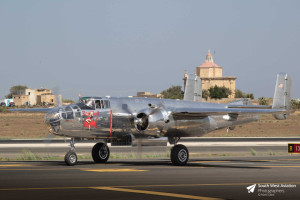 In a rarity to most airshows the display aircraft also featured in the static display prior to the flying display, including a huge amount of support from The Flying Bulls, the aviation/ airshow arm of ‘Red Bull ‘, the global energy drink brand, who brought a pair of Dassault Breguet/Dornier Alpha Jets, a Lockheed P-38L Lightning and North American B-25J-30-NC Mitchell. The latter two both presented in a polished metal finish which glistened in the hot Mediterranean sun. It must be said that the support ‘Red Bull’ brought to the show, not just in terms of The Flying Bulls but also in terms of the hospitality, was excellent as there was a complimentary ‘Red Bull’ bar in the aircrew enclosure throughout the week and their hospitality staff walking around offering complimentary cans on show days. Featuring on the jet pan outside the Aviation Cosmetics Malta Ltd hangar was a pair of German Air Force Eurofighter 2000s which were on static display only, joined by the Polish Air Force Lockheed Martin F-16C Fighting Falcon demo team, the Turkish Air Force General Dynamics F-16C Fighting Falcon ‘Solo Turk’ Demo team, the Swiss Air Force McDonnell Douglas F/A-18C Hornet solo demo and, making their Malta International Airshow debut, the Slovenian Air Force Pilatus PC-9(M) solo demo.